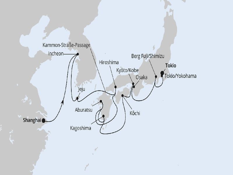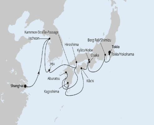 | Tag 8 23.03.2025 | PASSAGE-KAMMON-STRASSE (Seetag) Tauchen Sie ein in die faszinierende Passage durch die Kanmon-Straße an Bord Ihres Kreuzfahrtschiffs. Während Sie diese bedeutende Wasserstraße in Japan durchqueren, werden Sie von einer atemberaubenden Kulisse aus grünen Hügeln, malerischen Küstenlinien und historischen Wahrzeichen umgeben sein. Genießen Sie die entspannte Atmosphäre an Deck, während Sie das rege Treiben auf dem Wasser beobachten und die einzigartige Schönheit dieser besonderen Passage erleben. Eine unvergessliche Reise durch die Kanmon-Straße erwartet Sie während Ihrer Kreuzfahrt. |