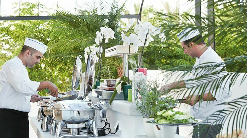 - Hauptrestaurant „Caramel The Restaurant“: griechisch, international, mediterran, regional, Fisch/Meeresfrüchte, Grillgerichte, Sushi, Babynahrung, glutenfreie Gerichte, Kindermenü, vegetarische Gerichte, Buffet, Showcooking, Anfrage & Reservierung nicht notwendig, April – Oktober, täglich 18:30 Uhr – 21:30 Uhr, mit Terrasse, Kinderhochstuhl, angemessene Kleidung erwünscht