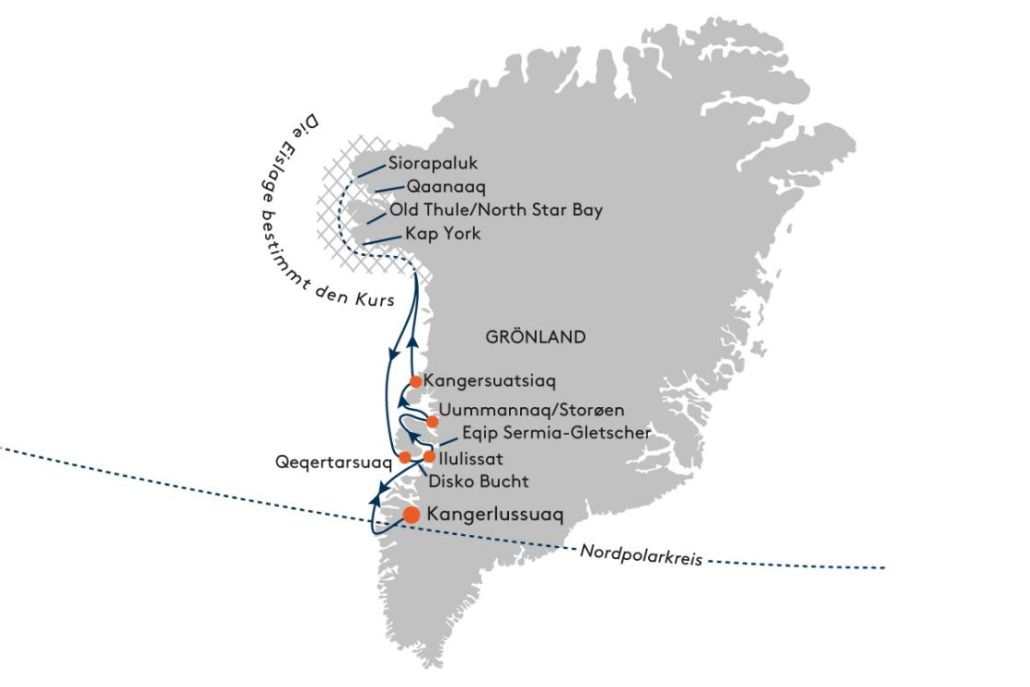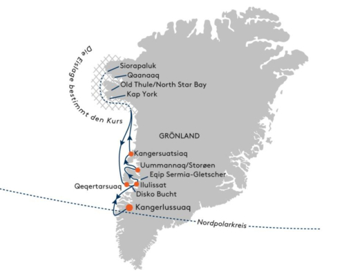 | Tag 10 – 12 | WESTKÜSTE GRÖNLANDS (Qeqertarsuaq, Ilulissat, Disko Bucht) Qeqertarsuaq auf der Disko Insel begrüßt Sie mit einem Walknochen-Tor und Chancen zur Walbeobachtung. Erkunden Sie das Basaltgebirge oder die arktische Tundra mit Ihren Experten. In Ilulissat erwartet Sie der Eisfjord, ein UNESCO-Welterbe mit der höchsten Eisbergdichte Grönlands. Krönender Abschluss ist die Disko Bucht, wo Sie vom Schiff und Zodiac aus die majestätischen Eisskulpturen des Sermeq Kujalleq-Gletschers bestaunen – unvergessliche Momente eines einzigartigen Polarabenteuers. (F,M,A) |