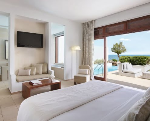 Suite, Nordseite, Gartenseite, Gartenblick, Innenhofblick, ca. 85 m², Gesamtanzahl der Räume in diesem Zimmertyp: 2, Aufteilung wie folgt: kombiniertes Wohn-/Schlafzimmer, 1 Schlafzimmer, 2 Einzelbetten (90x200cm), 1 Doppelbett (180x200cm), Babybett: ohne Gebühr, Anfrage & Reservierung nicht notwendig, Klimaanlage: ohne Gebühr, individuell regelbar, Heizung: individuell regelbar, Fußboden: Fliesenboden, Safe: ohne Gebühr, Sofa, Schreibtisch, Kaffee-/Teezubereiter, Wasserkocher, Minibar: gegen Gebühr, Softdrinks: gegen Gebühr, Wasser: gegen Gebühr, alkoholische Getränke: gegen Gebühr, Snacks: gegen Gebühr, Minibarauffüllung: täglich 09:00 Uhr – 14:00 Uhr, Telefon, Internet: WLAN/WiFi: ohne Gebühr, Fernseher: Flatscreen, im Schlafzimmer, deutsches Programm, Sat-TV, DVD-Player, CD-Player, Roomservice: täglich 24 Stunden, gegen Gebühr, Reinigungsservice: täglich, ohne Gebühr, separate Dusche, Regendusche, Badewanne, WC, Bademantel: ohne Gebühr, Slipper: ohne Gebühr, Föhn, Kosmetikspiegel, Terrasse: mit Liegen, mit Sitzgelegenheit, mit Private Pool - Amirandes Creta Villa Sea View Private Pool: