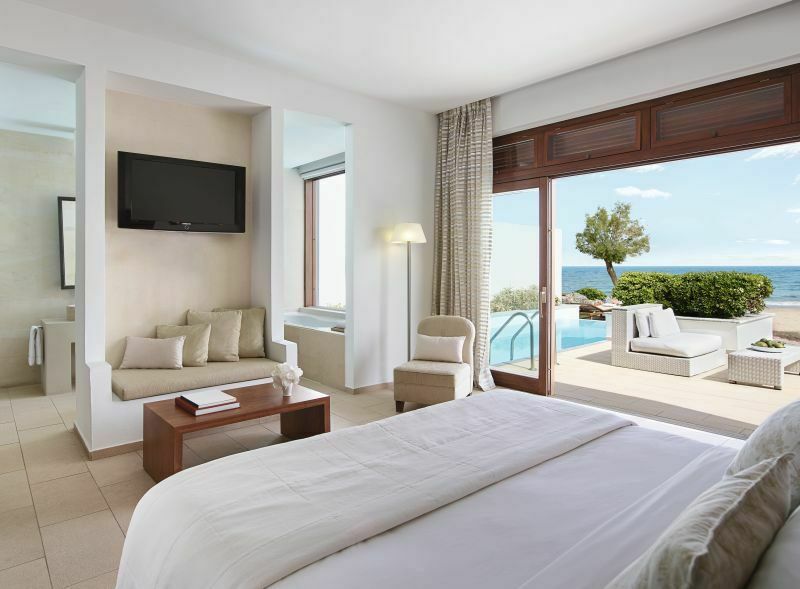 Villa, Meerseite, Meerblick, ca. 65 m², Gesamtanzahl der Räume in diesem Zimmertyp: 2, Aufteilung wie folgt: kombiniertes Wohn-/Schlafzimmer, Maisonette, 1 Schlafzimmer, 1 Doppelbett (180x200cm), 2 Schlafsofas (80x200cm), Babybett: ohne Gebühr, Anfrage & Reservierung nicht notwendig, Klimaanlage: ohne Gebühr, individuell regelbar, Heizung: individuell regelbar, Fußboden: Fliesenboden, Parkett, Safe, Sofa, Nespressomaschine, Kaffee-/Teezubereiter, Wasserkocher, Minibar: gegen Gebühr, Softdrinks: gegen Gebühr, Wasser: gegen Gebühr, alkoholische Getränke: gegen Gebühr, Snacks: gegen Gebühr, Minibarauffüllung: täglich 09:00 Uhr – 14:00 Uhr, Telefon, Internet: WLAN/WiFi: ohne Gebühr, Fernseher: Flatscreen, im Wohnbereich, im Schlafzimmer, deutsches Programm, Sat-TV, DVD-Player, CD-Player, Roomservice: täglich 24 Stunden, gegen Gebühr, Reinigungsservice: täglich, ohne Gebühr, separate Dusche, WC, separates WC, Bademantel: ohne Gebühr, Slipper: ohne Gebühr, 2 Bäder, Föhn, Kosmetikspiegel, Balkon: mit Sitzgelegenheit, Terrasse: mit Liegen, mit Sitzgelegenheit, mit Private Pool - Creta Beach Villa Sea View Private Pool: