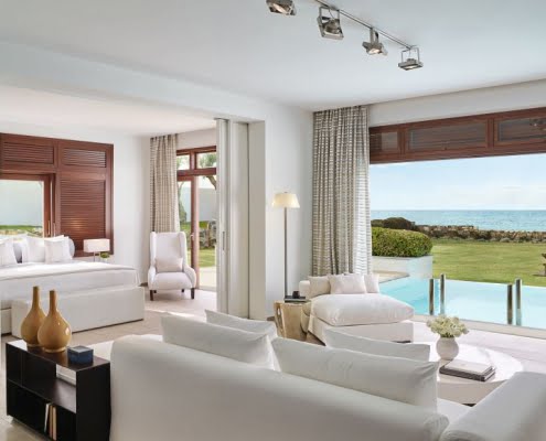 Juniorsuite, Meerseite, Nordseite, Meerblick, ca. 61 m², Gesamtanzahl der Räume in diesem Zimmertyp: 1, Aufteilung wie folgt: kombiniertes Wohn-/Schlafzimmer, 1 Doppelbett (180x200cm), Babybett: ohne Gebühr, Anfrage & Reservierung nicht notwendig, Klimaanlage: ohne Gebühr, individuell regelbar, Heizung: individuell regelbar, Fußboden: Fliesenboden, Safe: ohne Gebühr, Sofa, Schreibtisch, Kaffee-/Teezubereiter, Wasserkocher, Minibar: gegen Gebühr, Softdrinks: gegen Gebühr, Wasser: gegen Gebühr, alkoholische Getränke: gegen Gebühr, Snacks: gegen Gebühr, Minibarauffüllung: täglich 09:00 Uhr – 14:00 Uhr, Telefon, Internet: WLAN/WiFi: ohne Gebühr, Fernseher: Flatscreen, im Schlafzimmer, deutsches Programm, Sat-TV, DVD-Player, CD-Player, Roomservice: täglich 24 Stunden, gegen Gebühr, Reinigungsservice: täglich, ohne Gebühr, separate Dusche, Regendusche, Badewanne, WC, Bademantel: ohne Gebühr, Slipper: ohne Gebühr, Föhn, Kosmetikspiegel, Terrasse: mit Liegen, mit Sitzgelegenheit, mit Private Pool - Amirandes VIP 2Bedroom Gym with Private Pool: