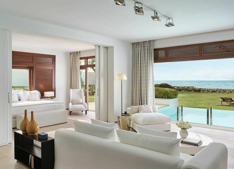Villa, erste Strandreihe, Meerseite, Meerblick, ca. 85 m², Gesamtanzahl der Räume in diesem Zimmertyp: 3, Aufteilung wie folgt: Wohnzimmer, 2 Schlafzimmer, 2 Einzelbetten (90x200cm), 1 King Size Bett (200x200cm), Babybett: ohne Gebühr, Anfrage & Reservierung nicht notwendig, Klimaanlage: ohne Gebühr, individuell regelbar, Heizung: individuell regelbar, Fußboden: Fliesenboden, Safe: ohne Gebühr, Sitzecke, Sofa, Schreibtisch, Nespressomaschine, Kaffee-/Teezubereiter, Wasserkocher, Esstisch, Minibar: gegen Gebühr, Softdrinks: gegen Gebühr, Wasser: gegen Gebühr, alkoholische Getränke: gegen Gebühr, Snacks: gegen Gebühr, Minibarauffüllung: täglich 09:00 Uhr – 14:00 Uhr, Telefon, Internet: WLAN/WiFi, Fernseher: Flatscreen, im Wohnbereich, im Schlafzimmer, deutsches Programm, Sat-TV, DVD-Player, CD-Player, Roomservice: täglich 24 Stunden, gegen Gebühr, Reinigungsservice: täglich, ohne Gebühr, separate Dusche, Badewanne, WC, Bademantel: ohne Gebühr, Slipper: ohne Gebühr, 2 Bäder, Föhn, Kosmetikspiegel, Terrasse: mit Liegestühlen, mit Sitzgelegenheit, mit Private Pool, mit Privat-Garten - luxury room with sea view: