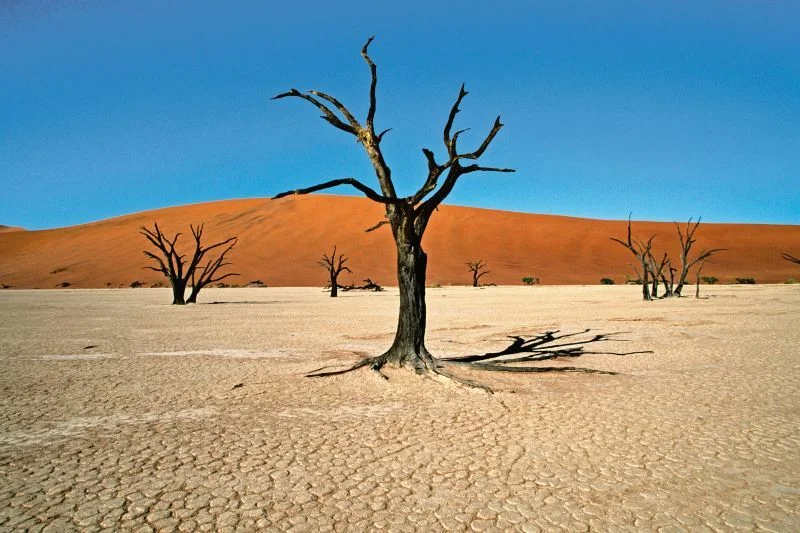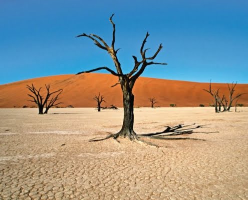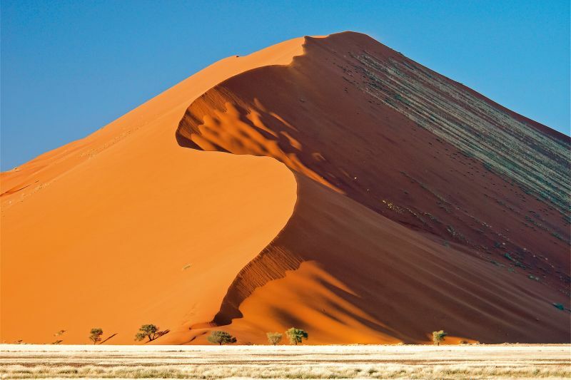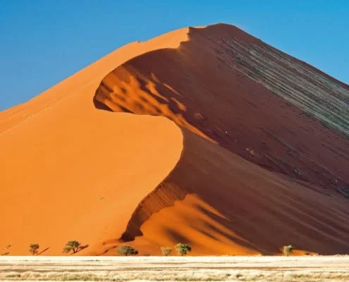 | Tag 9 | Namib Wüste Heute fahren Sie noch vor Sonnenaufgang nach Sossusvlei, um einige der höchsten Dünen der Welt bei einem Lichtspiel der Sonderklasse zu bewundern. Sobald die ersten Sonnenstrahlen auf die majestätischen Dünen fallen, verändert sich das um Sie liegende, wogende Sandmeer in eine Symphonie verschiedener Farben. Sie haben die Gelegenheit, einige der Dünen zu besteigen und auch andere Höhepunkte wie das surrealistische Dead Vlei zu besuchen. Auf dem Weg zurück zu Ihrer Lodge besichtigen Sie den Sesriem Canyon, der über 18 Mio. Jahre durch den Tsauchabfluss (der gleiche Trockenfluss, der bei Sossusvlei im Boden versinkt), in eine 30 m tiefe Schlucht gefräst wurde. Ca. 250 Km (F, M, A) |