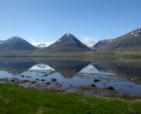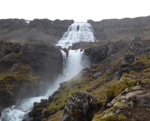 In der Frühe fahren wir mit der Fähre nach Brjánslækur. Die Fahrt dauert ungefähr 2,5 Stunden. Die Westfjords sind ein wahrer Naturschatz. Brjánsslækur, wo die Fähre ankommt, ist ein altes Herrenhaus und ein kirchlicher Ort an der Mündung des Vatnsfjörður. Dort ist eine alte Muschelfabrik, geschützte Ruinen, Flókatóftir. Auf dem Weg nach Ísafjörður sehen wir Dynjandi und einen einfach fesselnden Wasserfall. Wir fahren am Dorf Þingeyri vorbei, Þingeyri ist ein kleines Dorf auf einer Landzunge in einem der schönsten Fjorde Islands, Dýrafjörður. Wie in den meisten anderen Küstenorten Islands wurde die Kultur und Industrie im Laufe der Jahrhunderte vom Meer geprägt.
