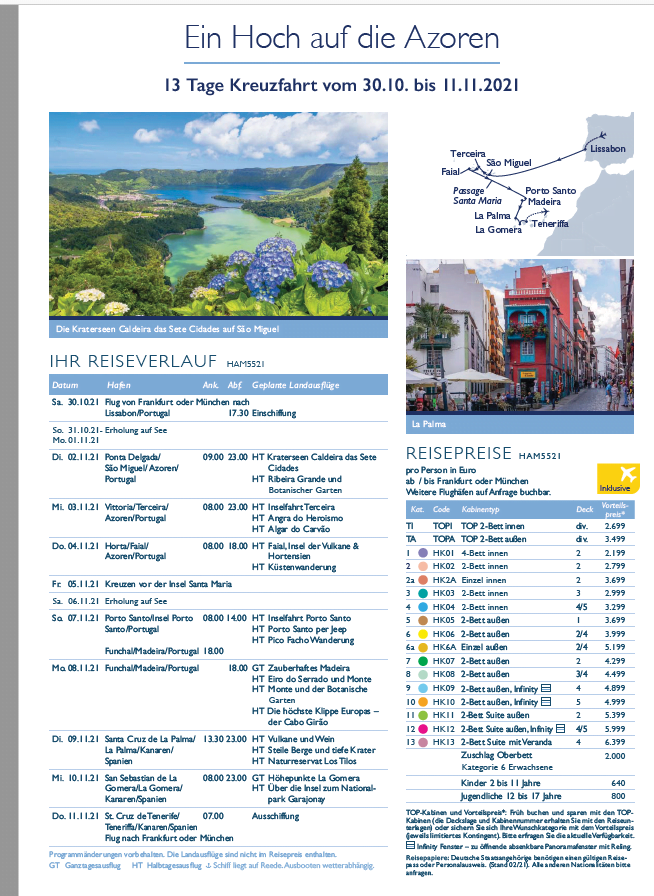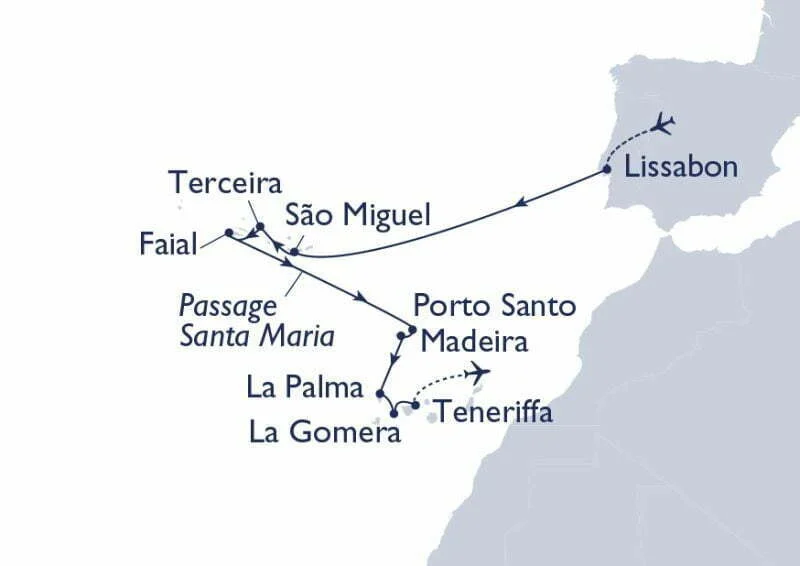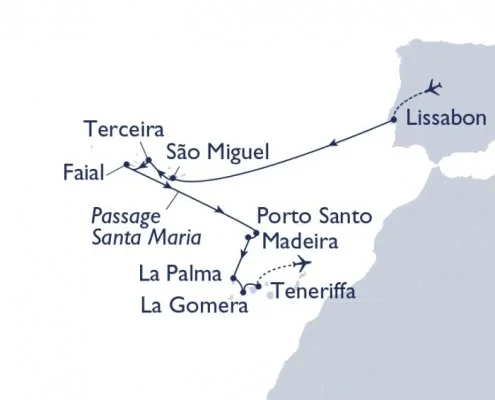Lust auf Inselvielfalt? In Lissabon eingeschifft sichten Sie nach einem Tag die weißen Prachtbauten auf Sao Miguel. Bewundern Sie den Schlot eines erloschenen Vulkans auf Terceira und atmen Sie auf Faial den Duft blühender Hortensien. Blicken Sie auf Madeira vom Pico Facho aus meilenweit über den tiefblauen Ozean. Suchen Sie auf La Palma die bizarrsten Vulkankrater und wandern Sie auf La Gomera durch die üppige Landschaft.