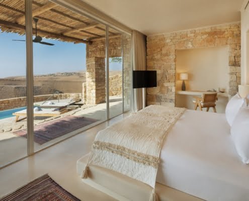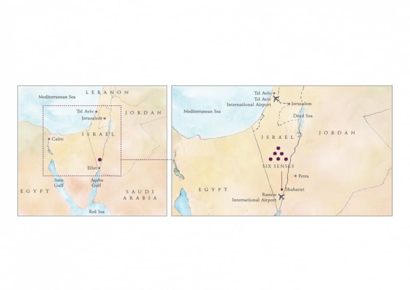 Das wunderschöne Six Senses Shaharut liegt in Israel, in der Negev Wüste im Arava Tal in der kleinen Gemeinde Shaharut.  Genau hier, auf einer Klippe mit Panorama über endlose Felsformationen und Sandfarben, befindet sich das Six Senses Shaharut. Auf 18 Hektar verteilen sich die 58 Villen und Suiten. Und natürlich ein Six Senses Spa. Die Villen sind nicht nur von den hier zu findenden Steinen inspiriert – sie sind aus ihnen gebaut. Die Farbgebung und die Außenanlagen mit Kakteen und heimischen Wüstenblumen passen sich der natürlichen Umgebung an.