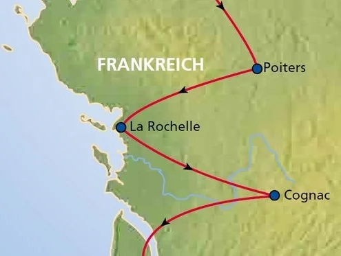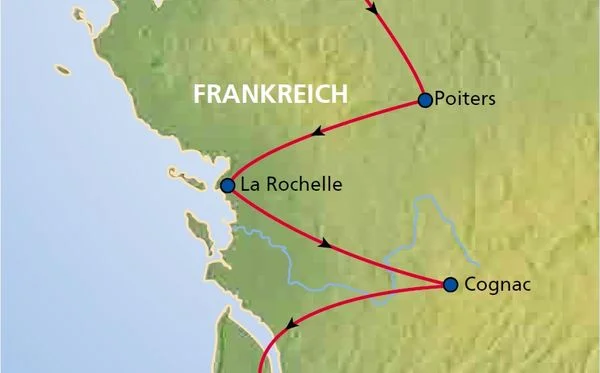 - Höhepunkte Ihrer Reise (Chateau de ducs de Bretagne in Nantes, Angers, Saumur und Poitiers, UNESCO-Welterbe: Abtei Fontevraud, Patrizierhäuser in La Rochelle, Antike und Mittelalter in und um Saintes, Hochprozentiges in Cognac, Weinprobe im Médoc)